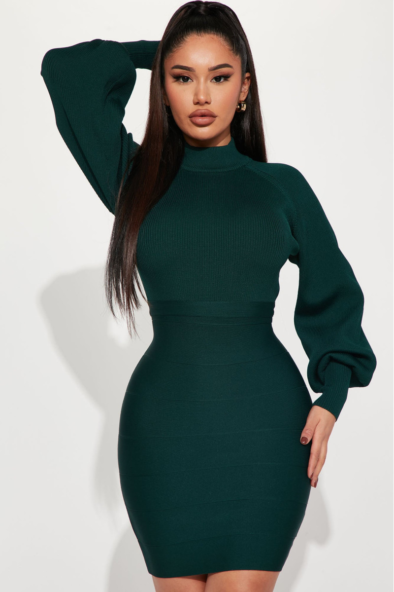 Ця сукня міні підкреслить вашу фігуру. Вона має комір-стійку та об'ємні довгі рукави, що додають образу вишуканості. Застібка-блискавка ззаду забезпечує зручне вдягання. Тканина добре тягнеться, адаптуючись до силуету. Склад: 90% поліестер, 10% спандекс. Імпортний товар.
