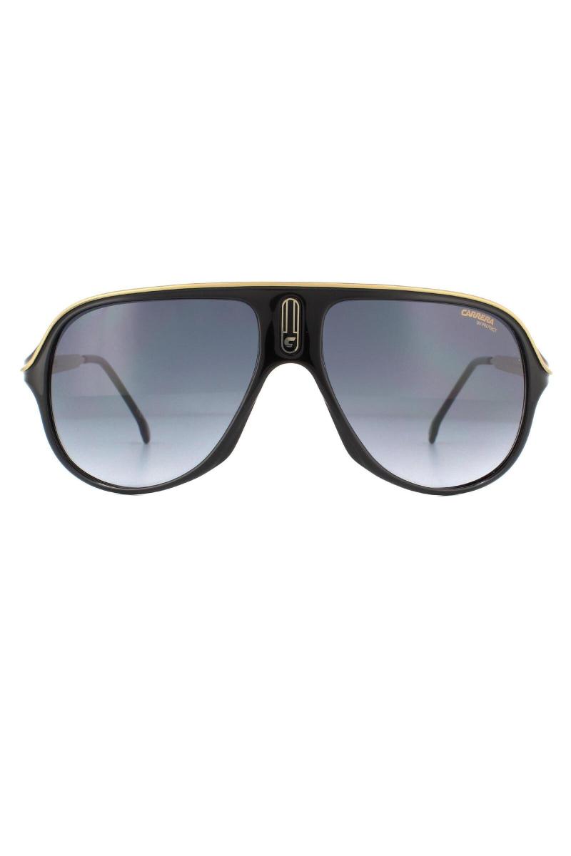Safari65/N 807 9o Чорний темно -сірий градієнт - це повна конструкція обода з лінзами у формі сліз та легкої пластикової рами, що містить C на мосту. Текстовий логотип Carrera вигравірований на струнких храмах для автентичності бренду.