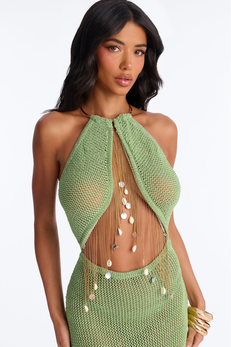Відчуйте справжню магію літа з цією ефектною сукнею максі. Вона прикрашена розкішною бахромою та витонченим металізованим в'язанням гачком, що створює неймовірний візуальний ефект. Довжина максі додає грації, а блискучі елементи підкреслюють святковий настрій. Ця сукня - ідеальний вибір для незабутніх вечорів та особливих моментів.
